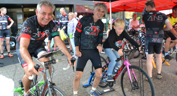 2.8.2021 Schermbeck (geg). Ordentlich in die Pedale getreten wurde am Samstag vor dem Ausstellungsraums von Gregor und Ludger Zens an der Erler Straße.  Bei dem 12 Stunden Spendenmarathon, der ziemlich spontan organisiert wurde,  sind am Samstag auf den Standrädern insgesamt 1.222 km zusammengekommen. Die Brüder Zens freuen sich:" Eine tolle Leistung aller Radler, die drei Fahrräder waren durchgehend besetzt, da wurde richtig in die Pedale getreten." Selbst die ordentlichen Schauer die zwischendurch niederprasselten, konnten auch die Besucher nicht abhalten die gekommen waren um anzufeuern, etwas ins Schwein zu schmeißen oder selbst zu fahren. Schon vor dem eigentlichen Start um 10 Uhr war bereits eine Spendensummer von 700 Euro im "Sparschwein".