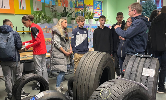 Neben der Bundeswehr oder Evonik, die schon mehrmals Teil des Berufsinformationsabends waren, kamen auch dieses Mal wieder mehrere neue Anbieter dazu. Die KFZ Reparaturwerkstatt Wilskamp + Terhardt brachte für anschauliche Informationen mehrere Reifen für Motorräder bis hin zu Treckerreifen mit und zeigte Fotomaterial aus der Werkstatt. Mit dabei war ein ehemaliger Schüler der Gesamtschule Schermbeck, der an seiner ehemaligen Schule neuen Schülerinnen und Schülern seinen Ausbildungsberuf näherbringen konnte.